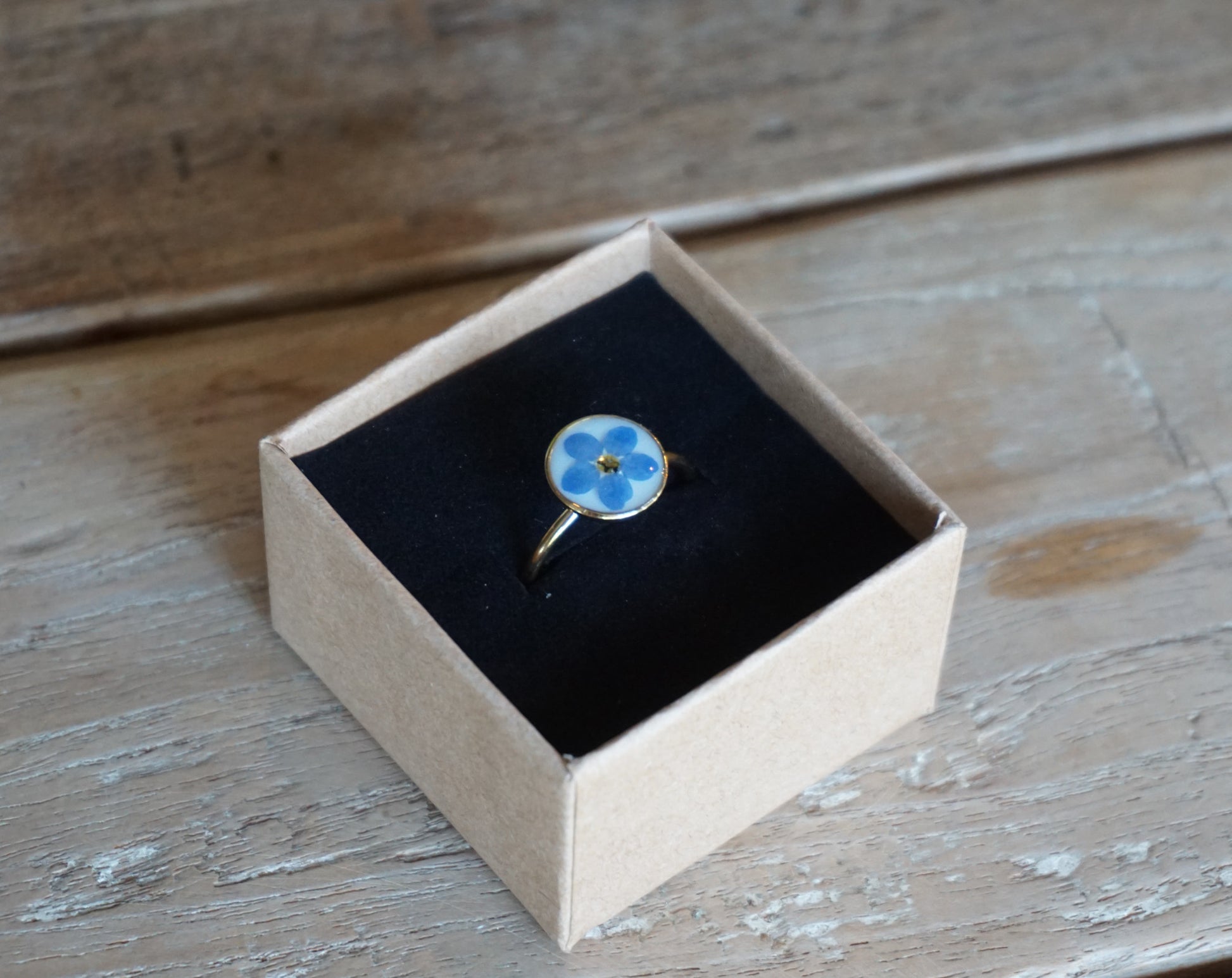 Comme un éclat du ciel cueilli au jardin, cette bague délicate renferme une véritable fleur de Myosotis, chargée de symbolisme.