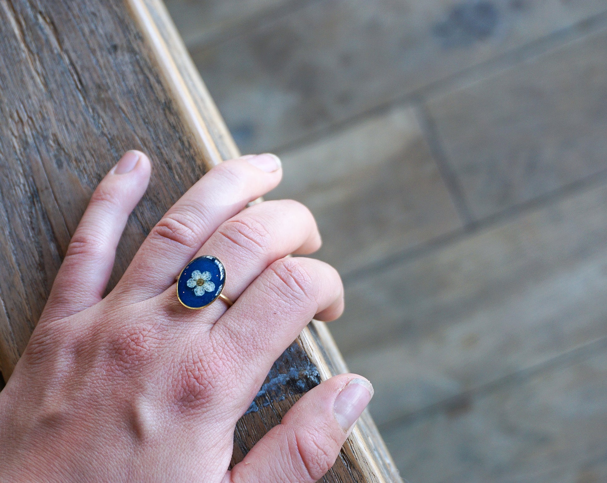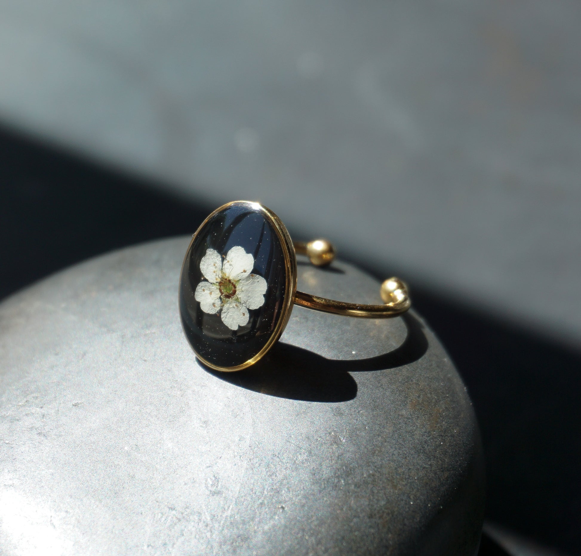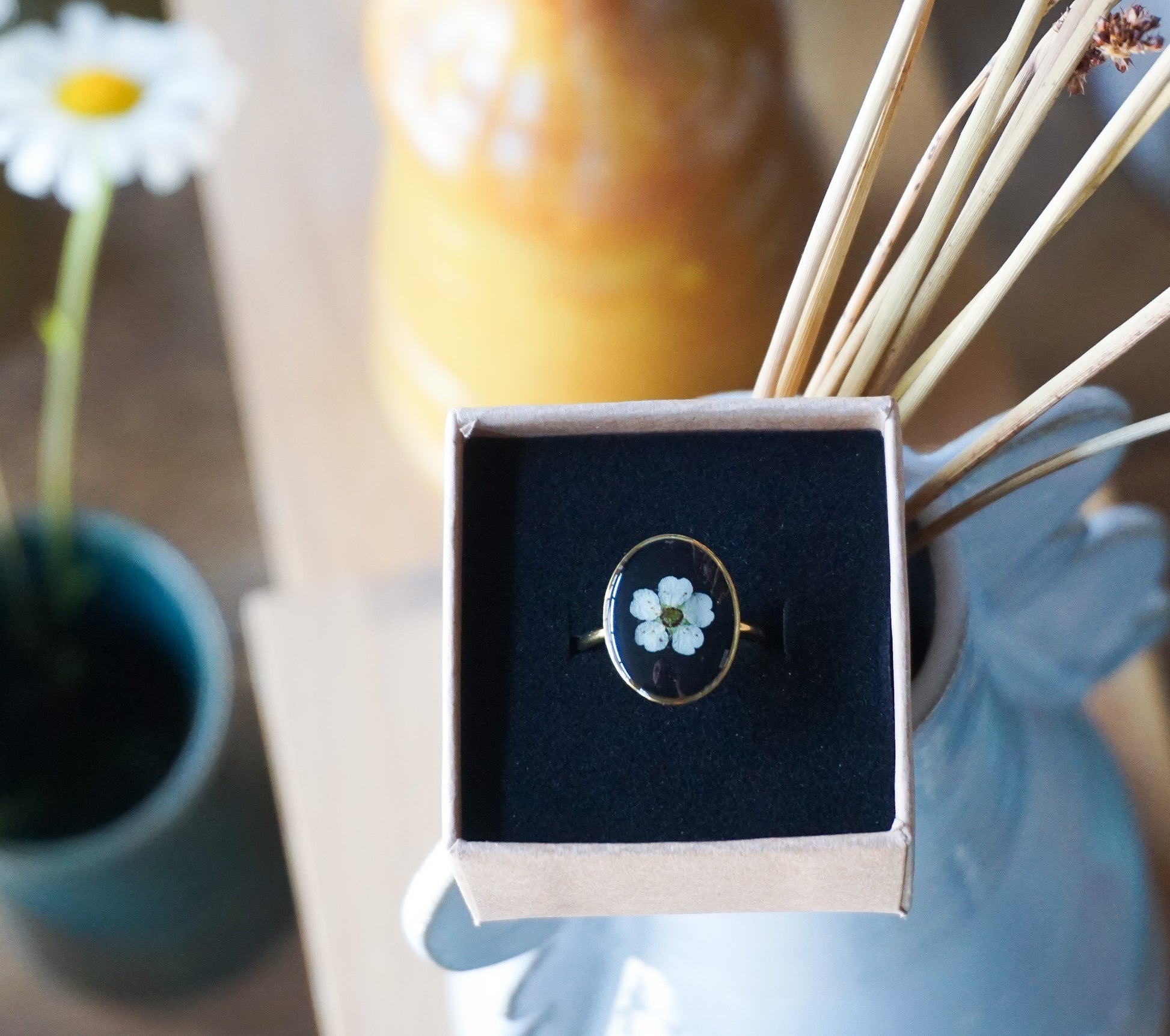 Cette bague renferme une véritable petite fleur de Spirée, comme suspendue dans le temps.