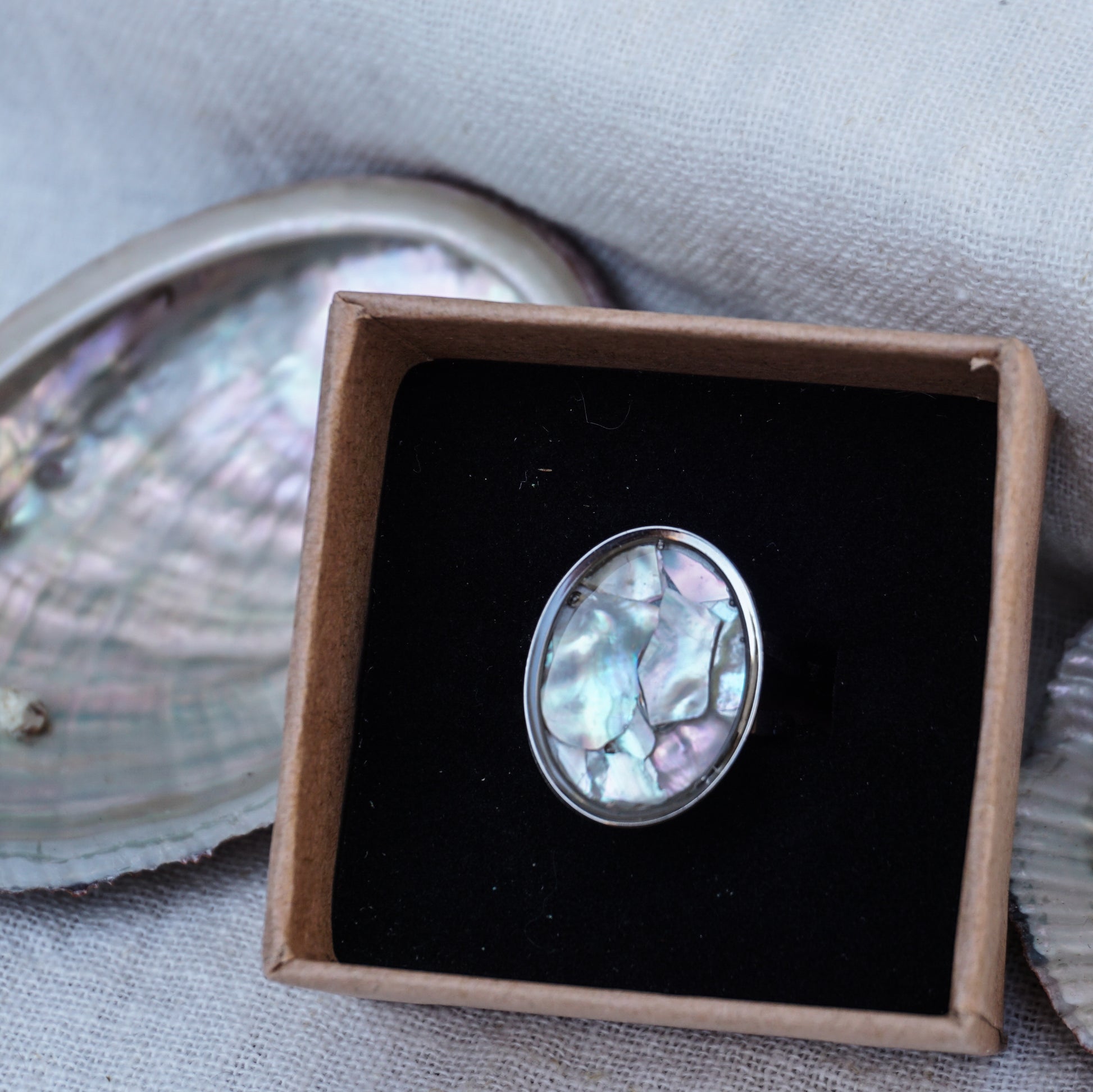 Son cabochon ovale met en valeur de véritables éclats d'ormeaux de Bretagne, soigneusement taillés et assemblés avec soin.