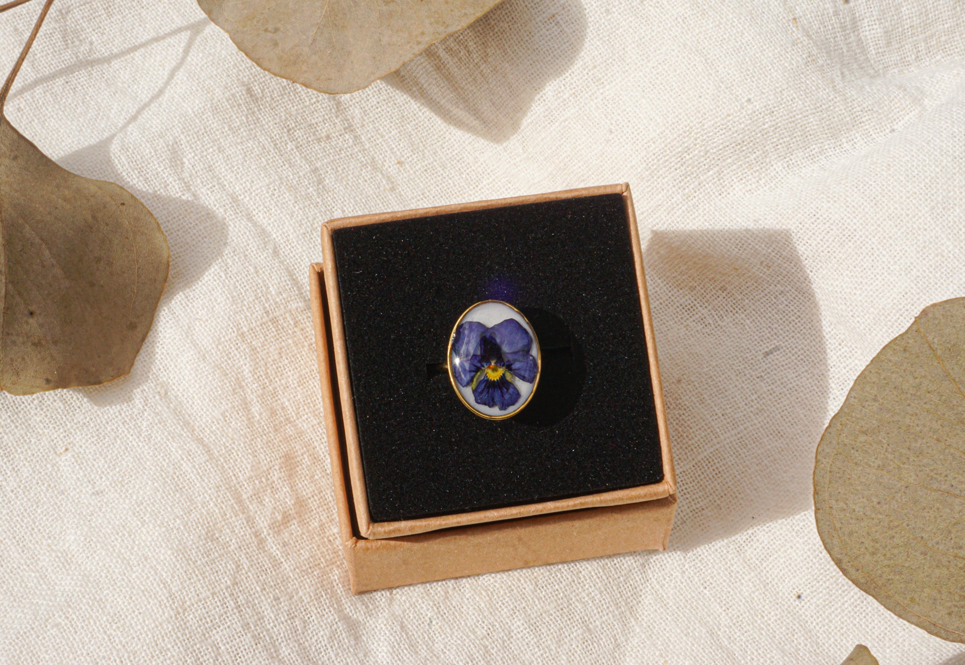 Portez un fragment de nature a votre doigt avec cette bague délicate renfermant une fleur de pensée.