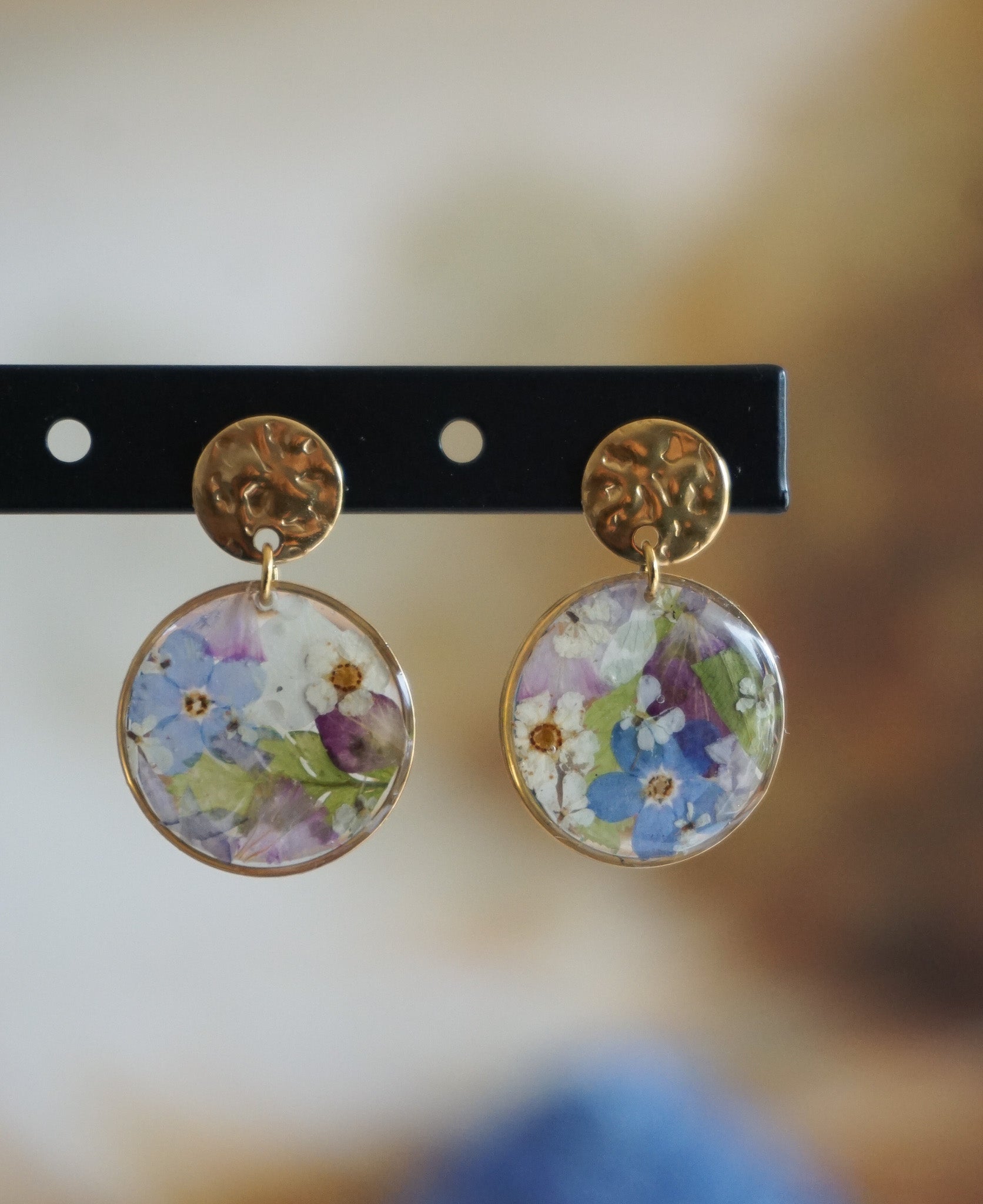 Chaque paire renferme un ensemble de petites fleurs délicatement pressées, capturées dans une goutte de résine cristalline.