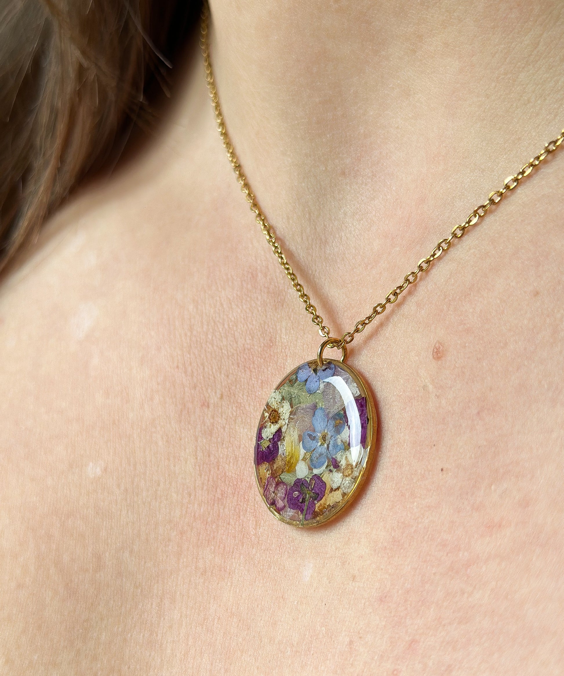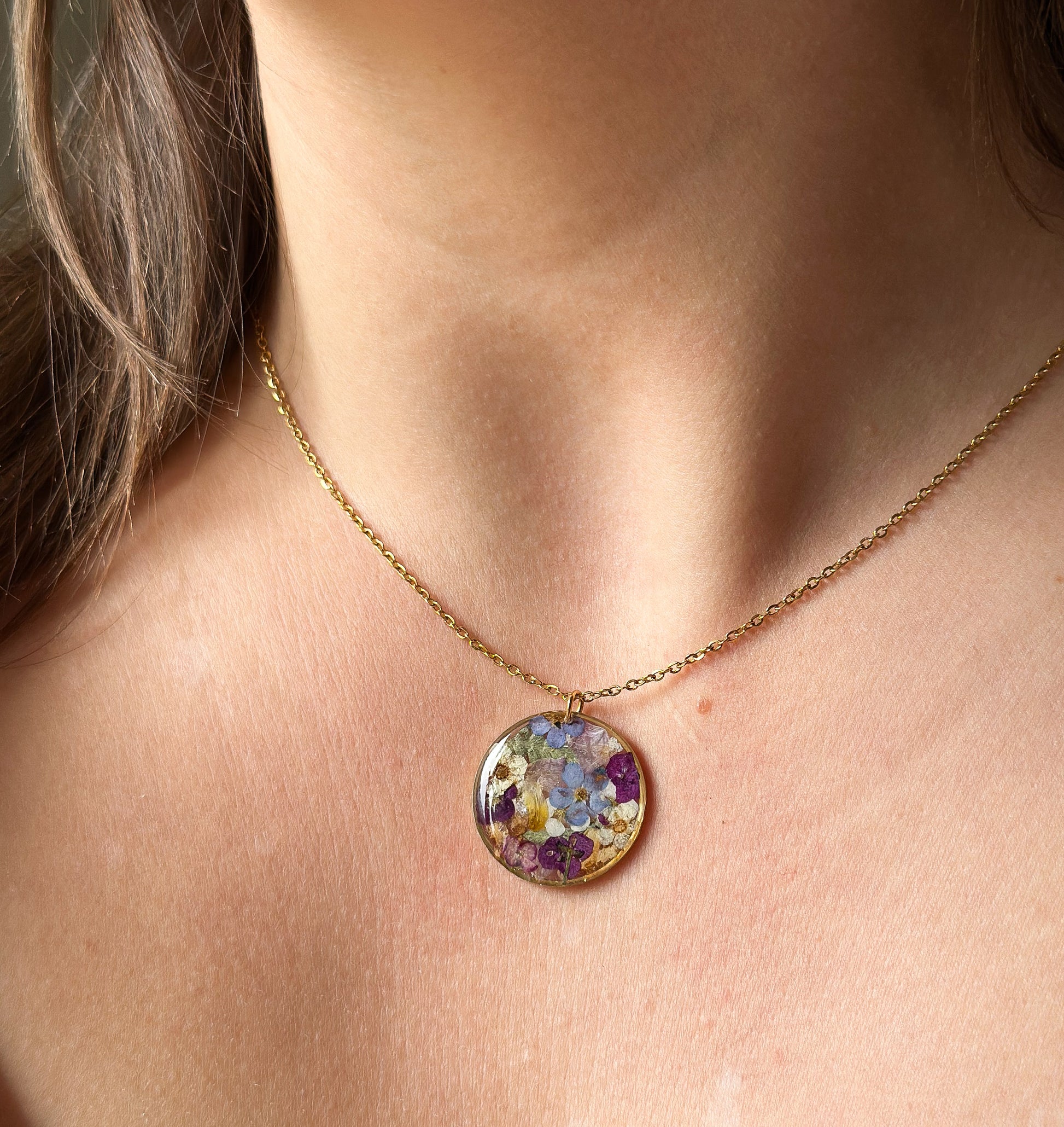 Chaque bijou renferme un ensemble de petites fleurs délicatement pressées, capturées dans une goutte de résine cristalline.