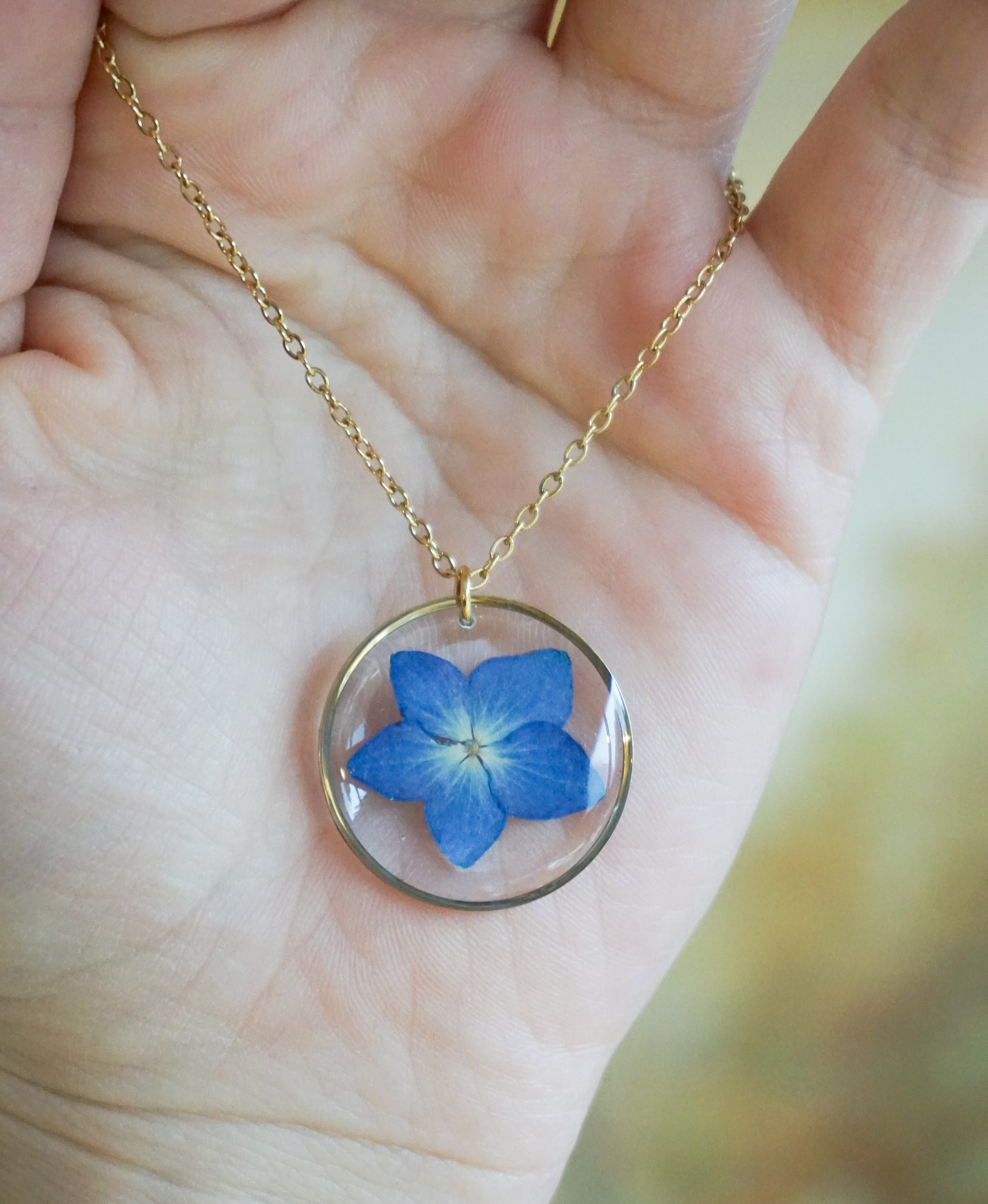Un fragment de notre nature Bretonne, capturé dans ce collier, avec son Hortensia bleu encapsulé.