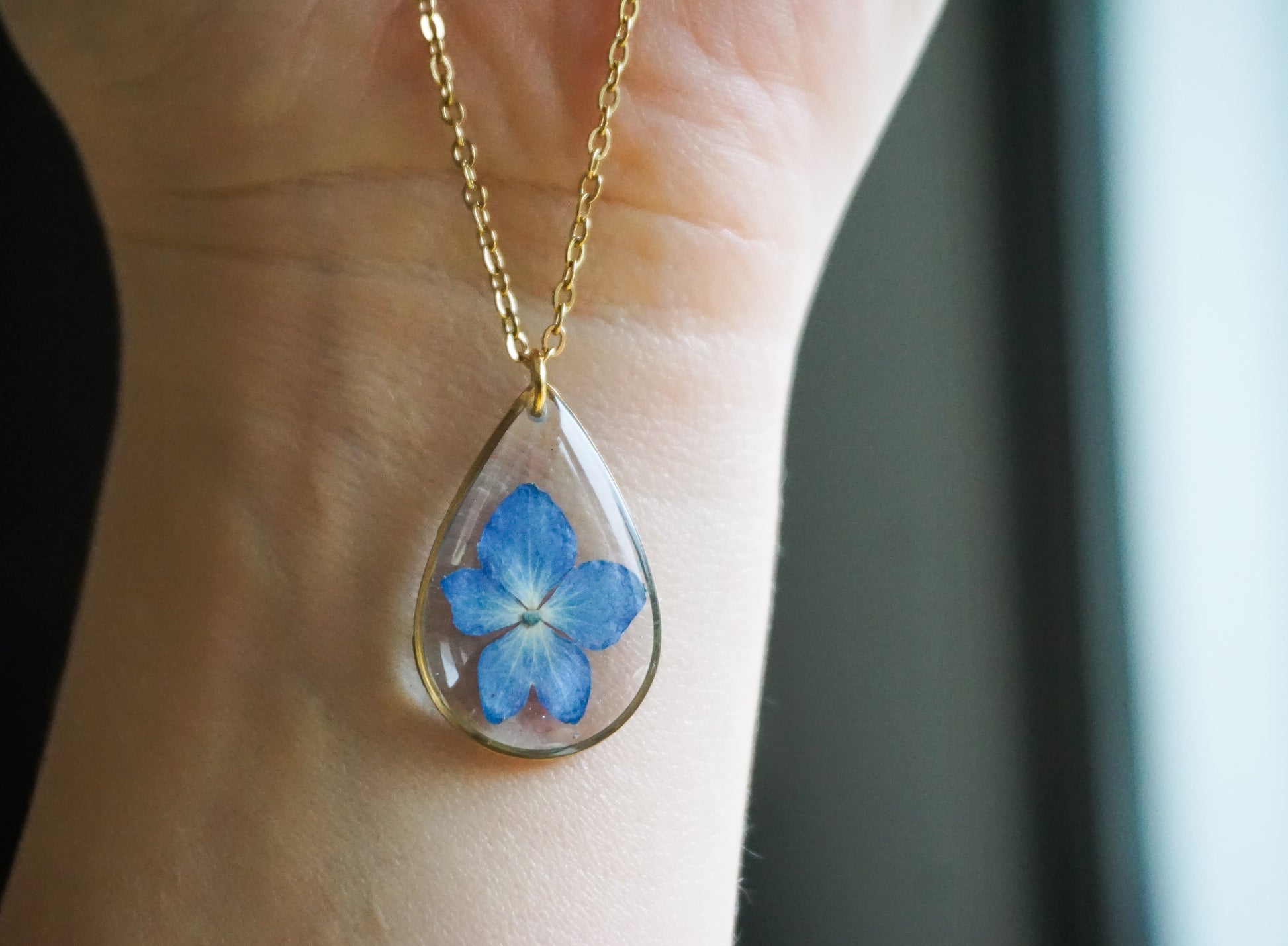 Un fragment de notre nature Bretonne, capturé dans ce collier, avec son Hortensia bleu, en forme de goutte.